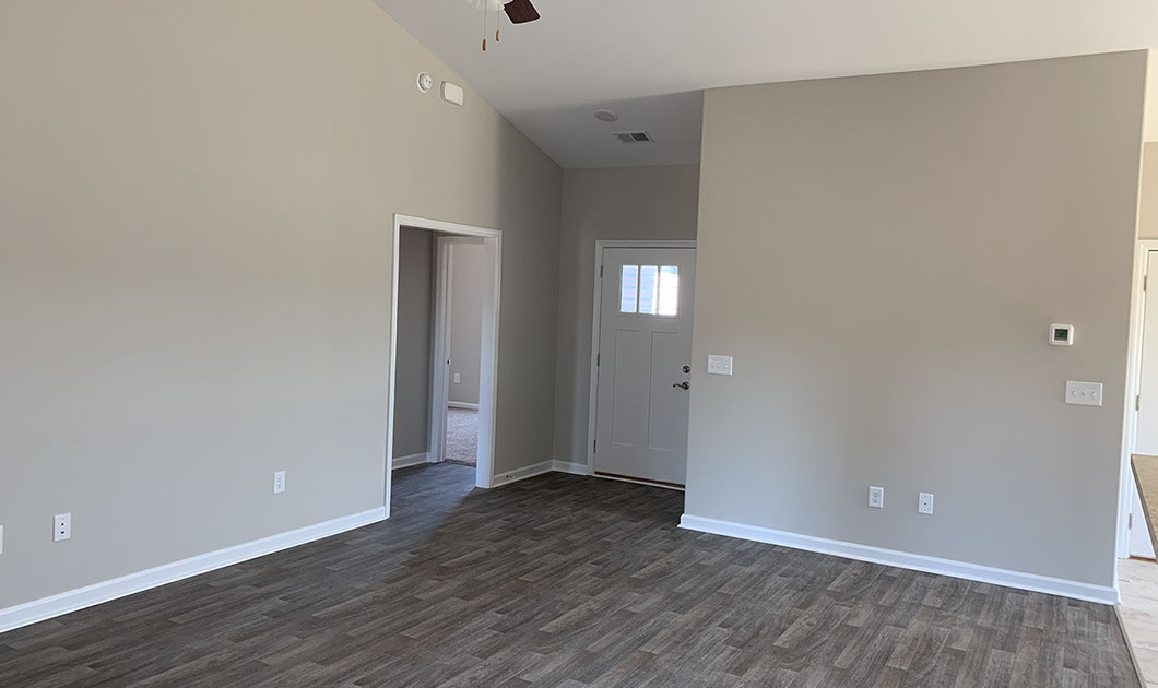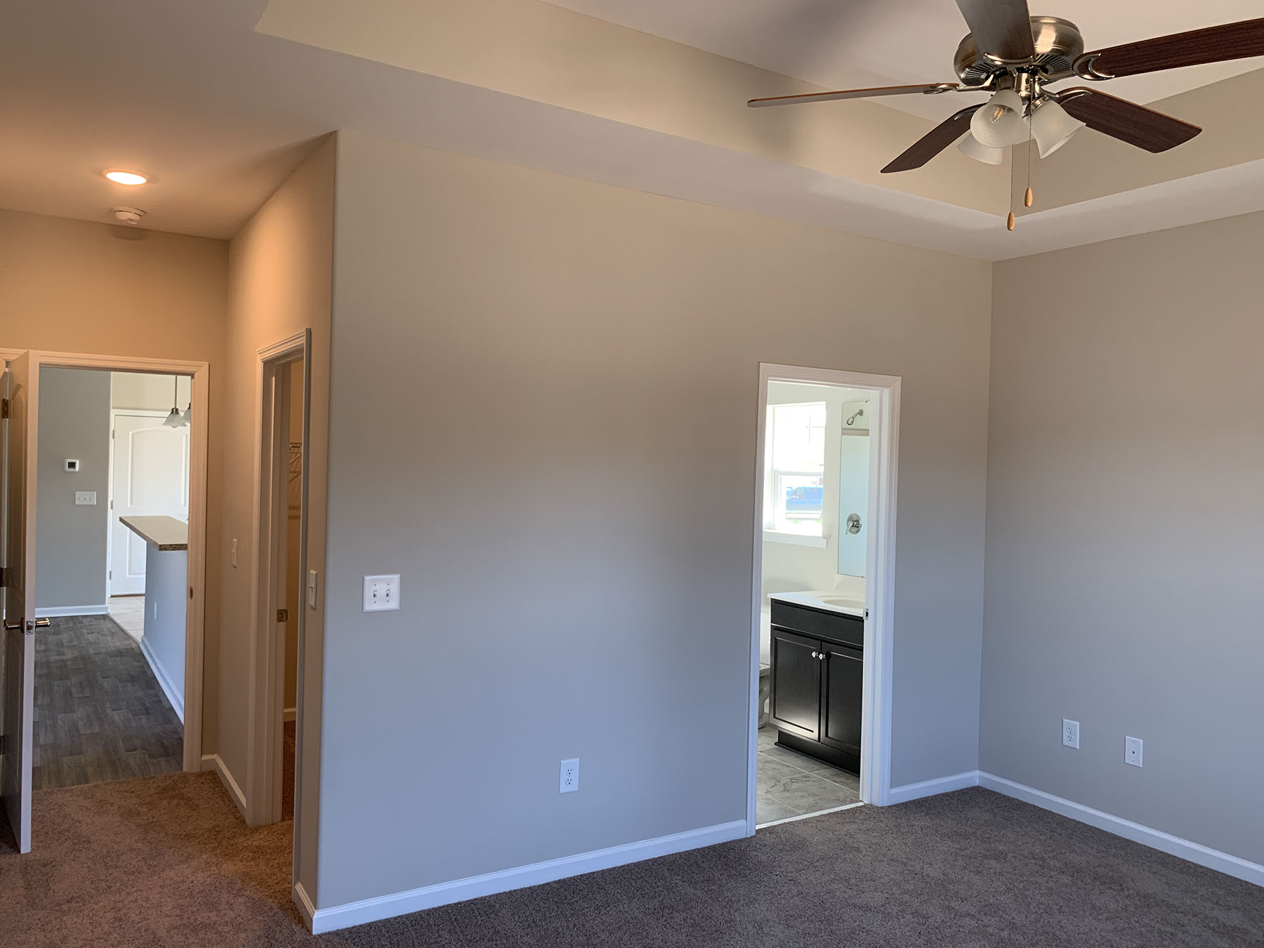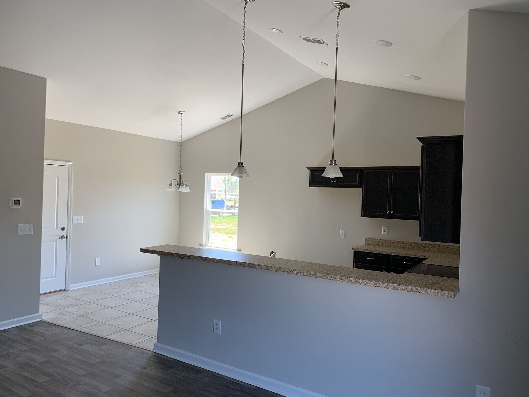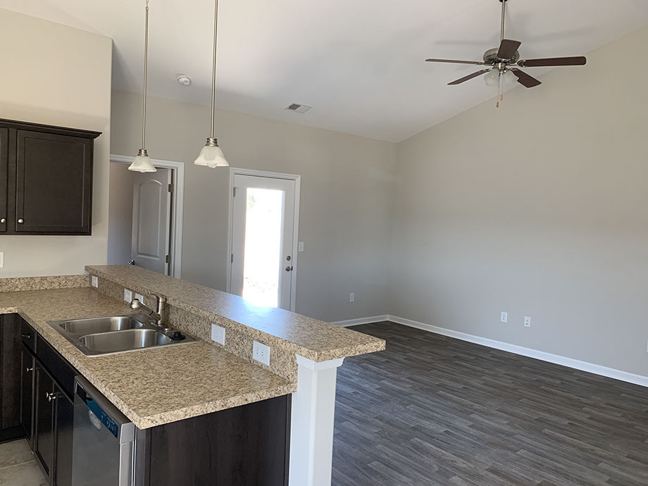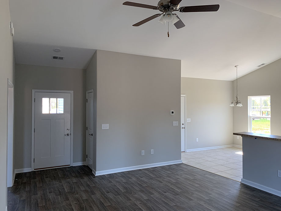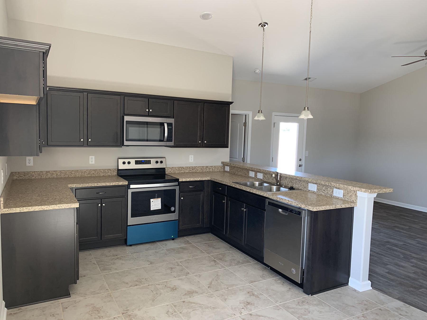 The Carolinian is an open 3 bedroom, 2 full bath split floor plan. The Carolinian comes standard with 18” tile flooring in all wet areas and your choice of vinyl flooring, carpet or a mix of both throughout the rest of the home. The kitchen is equipped with a breakfast bar, dining area, stainless steel appliances, pendant lighting, flushed LED lighting, cabinets that include crown, hardware and soft close drawers. The master bedroom features a spacious walk-in closet, tray ceiling, ceiling fan and a linen closet. One of the guest bedrooms has a vaulted ceiling and both guest bedrooms come standard with flushed LED lighting. All ceilings are standard at 9’ or vaulted. All garages are finished and have pull down stairs to access the attic storage. The garage door has windows, comes with a remote and is wi-fi capable. A gutter for the front door is included as a standard feature. Exterior landscaping features include, completely sodded yards, plant beds and street trees for you to enjoy.