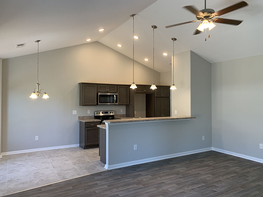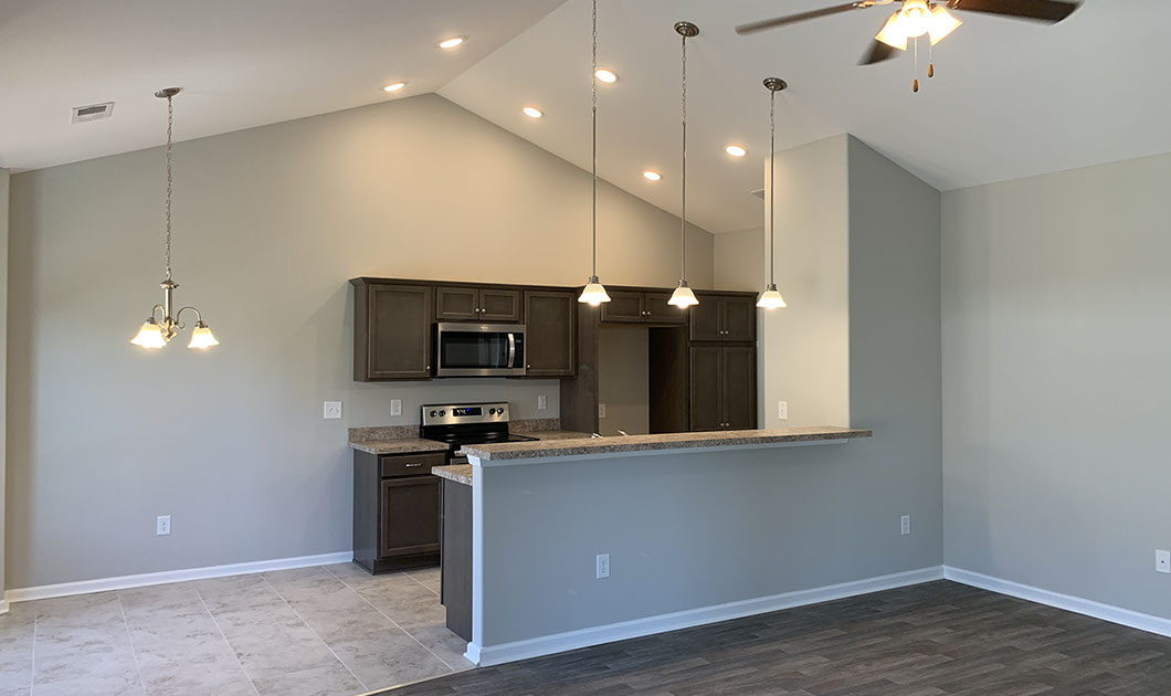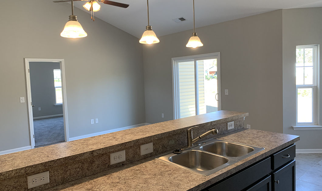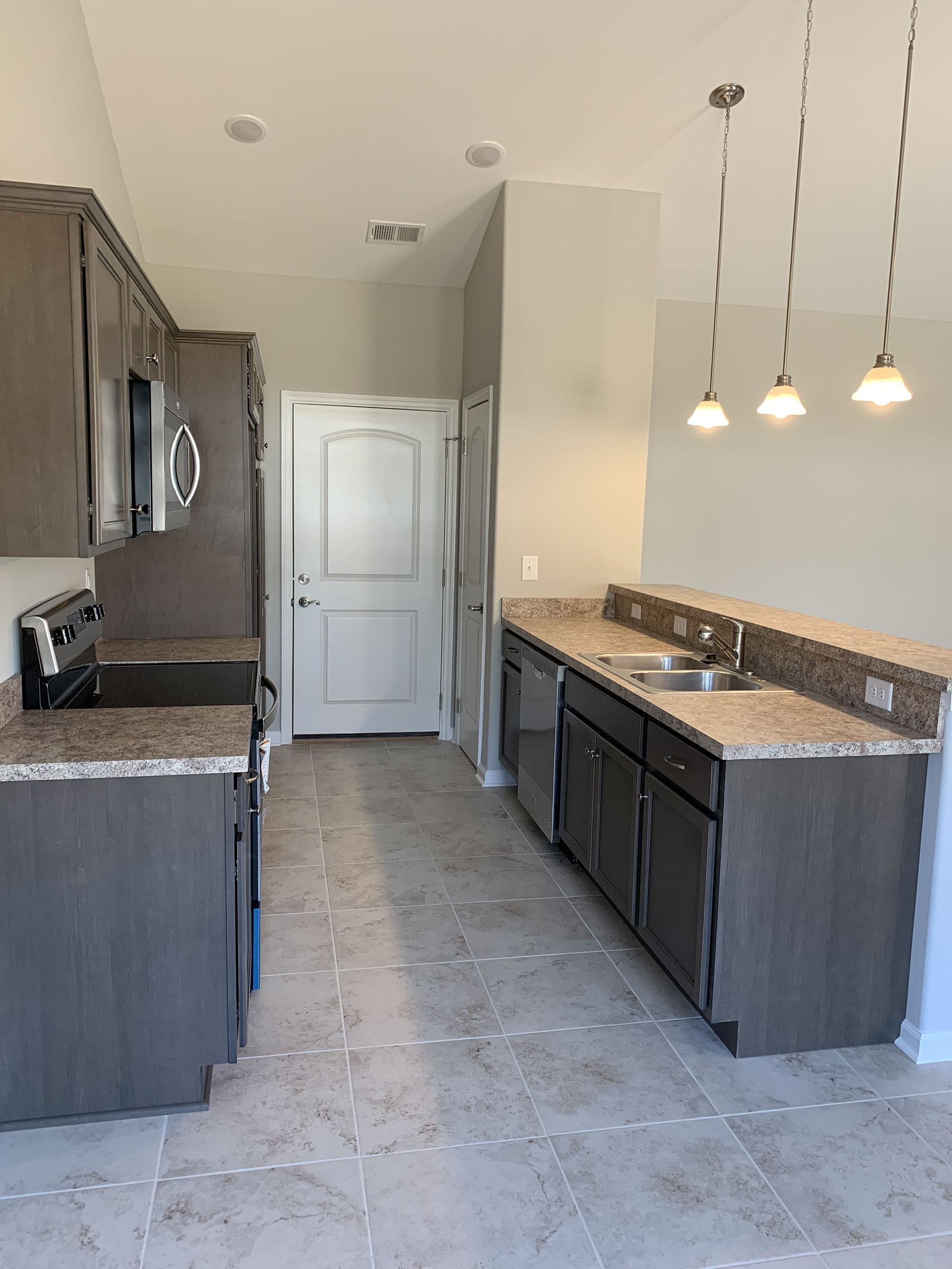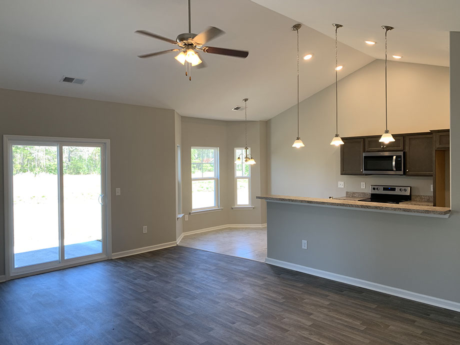 The Haley is an open 3 bedroom, 2 full bath floor plan. The Haley comes standard with 18” tile flooring in all wet areas and your choice of vinyl flooring, carpet or a mix of both throughout the rest of the home. The kitchen is equipped with a breakfast bar, dining area with a bay window, two pantry’s, stainless steel appliances, pendant lighting, flushed LED lighting, cabinets that include crown, hardware and soft close drawers. The master bedroom features a spacious walk-in closet, vaulted ceiling, ceiling fan and a linen closet. Both guest bedrooms come standard with flushed LED lighting. All ceilings are standard at 9’ or vaulted. All garages are finished and have pull down stairs to access the attic storage. The garage door has windows, comes with a remote and is wi-fi capable. A gutter for the front door is included as a standard feature. Exterior landscaping features include, completely sodded yards, a rear patio, plant beds and street trees for you to enjoy.